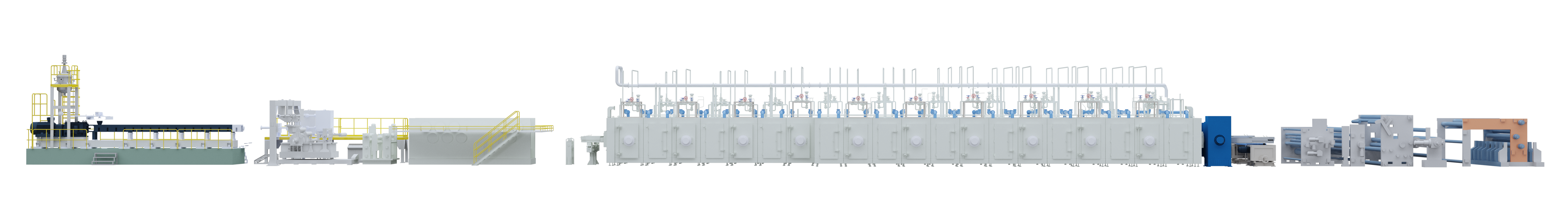 電容膜生產(chǎn)線由原料配送、擠出鑄片、縱向拉伸、橫向拉伸、后處理、收卷、分切等部分組成,用于生產(chǎn)各種規(guī)格具有優(yōu)良機(jī)械性能和電氣性能、良好的耐熱性、耐寒性、氣密性及尺寸穩(wěn)定性的雙軸定向電容膜。